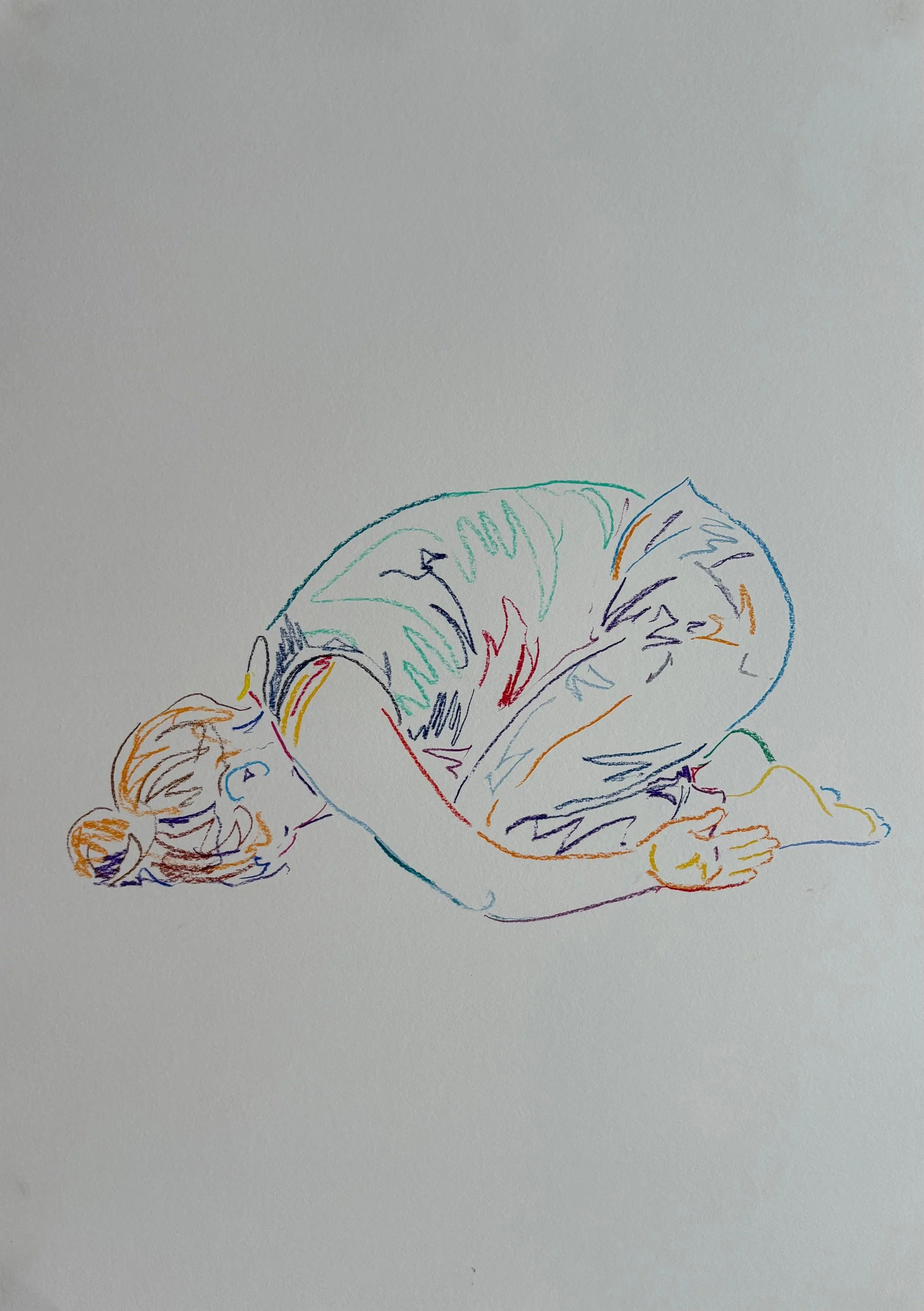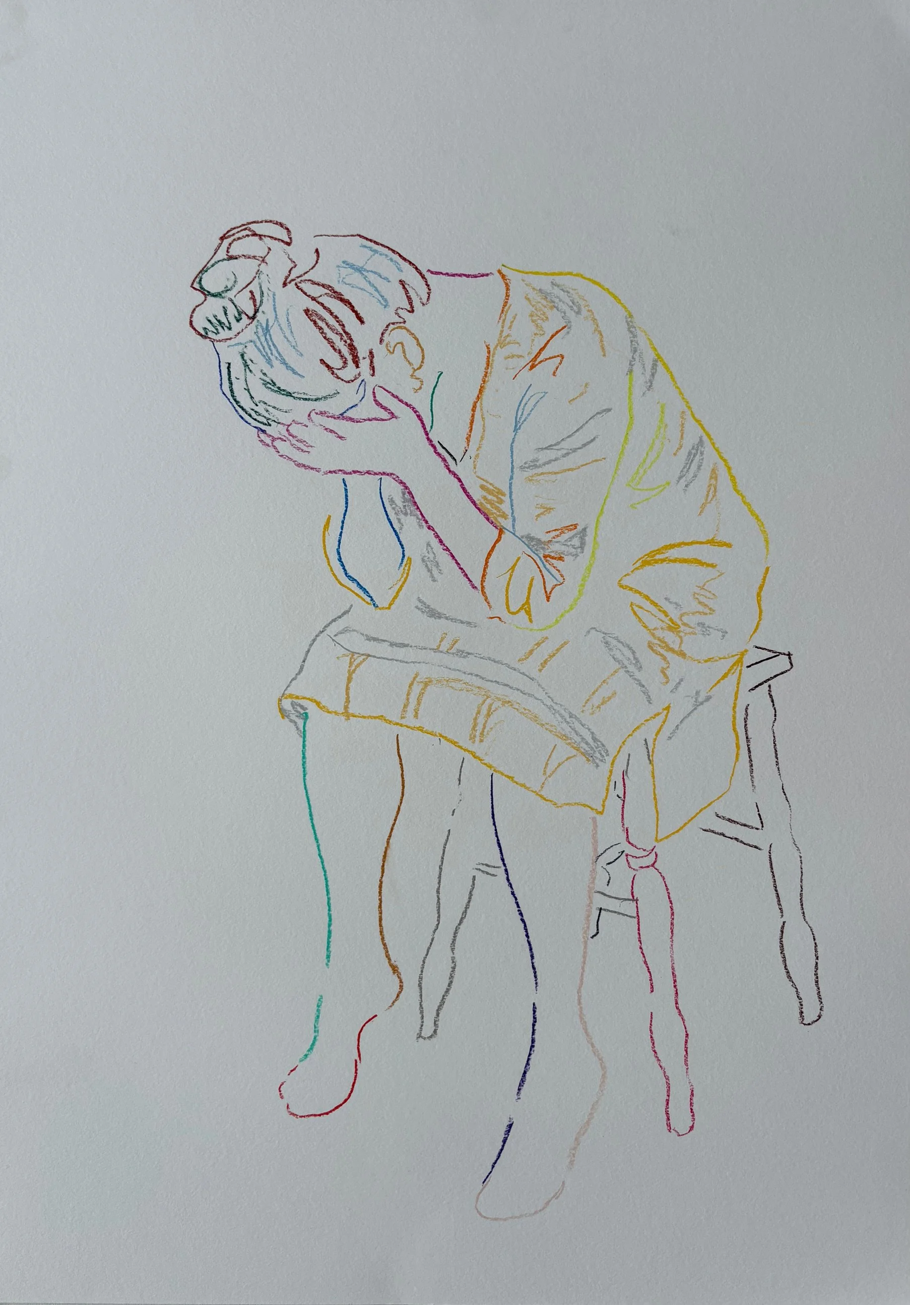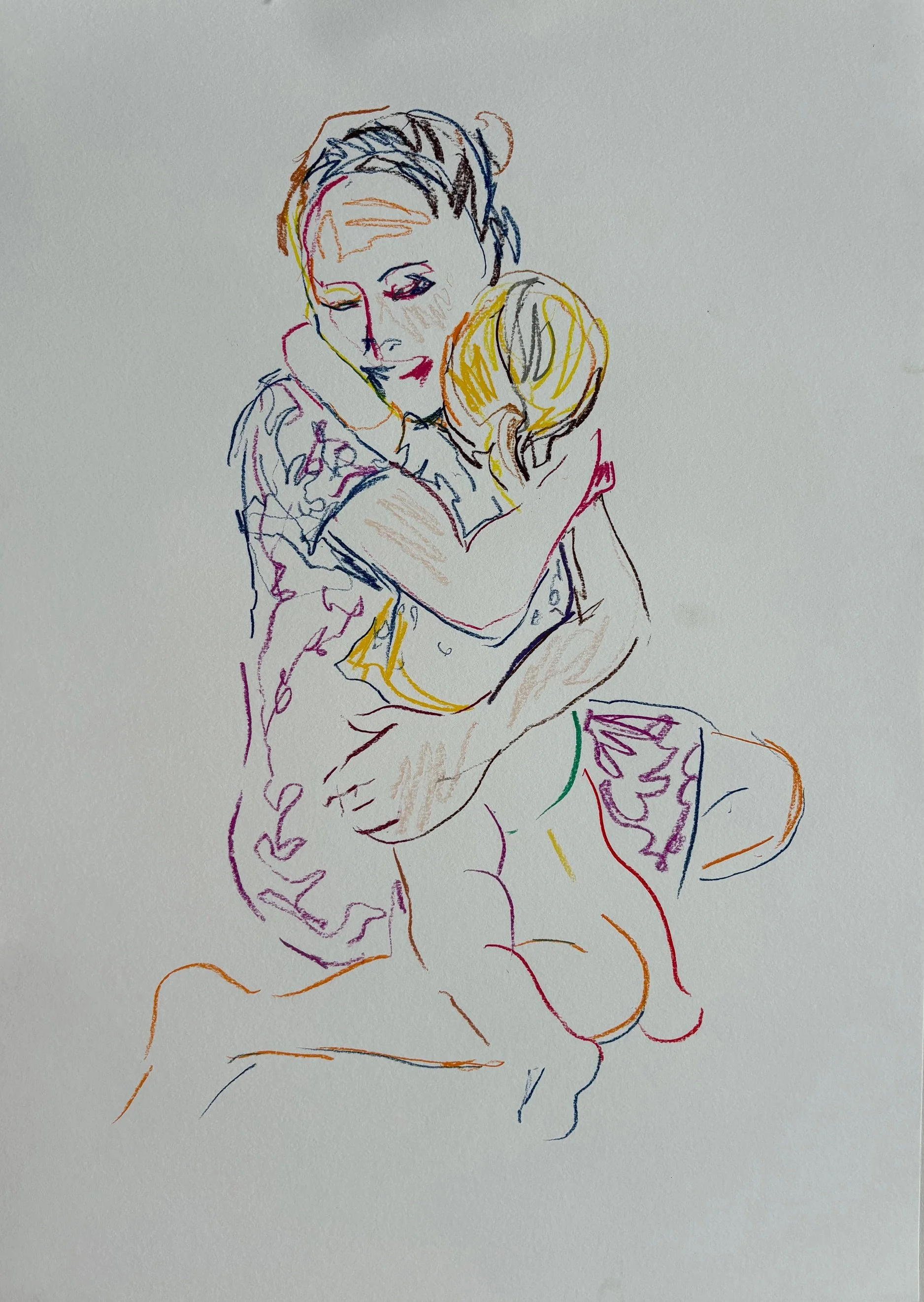 Brace Embrace explores my evolving relationship with motherhood as my children grow. The series of ten coloured line drawings captures intimate moments with them alongside self-portraits depicting rest, despair and resilience. Inspired by religious frescoes of grief, reverence and contemplation, the work conveys the simultaneous gentleness and existential intensity of mothering—wearisome, tender, oppressive, and ecstatic.